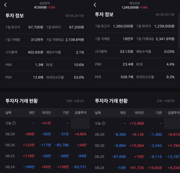 에코프로의 경우에는 거래량과 거래대금이 감소하고 있으며, 삼성전자도 주가의 하락과 거래량의 감소로 인해 위기감이 느껴지고 있습니다.